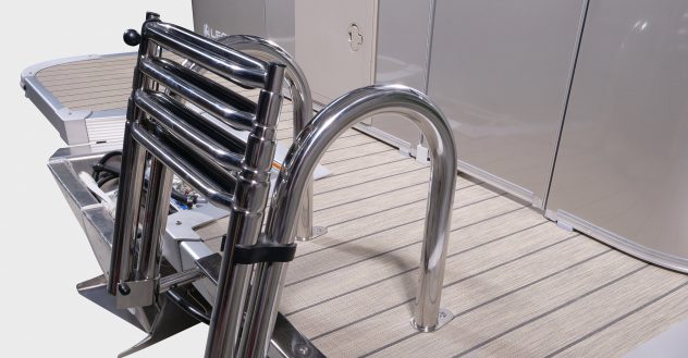 La grande échelle d'embarquement télescopique en acier inoxydable facilite la montée à bord après une baignade dans le lac.